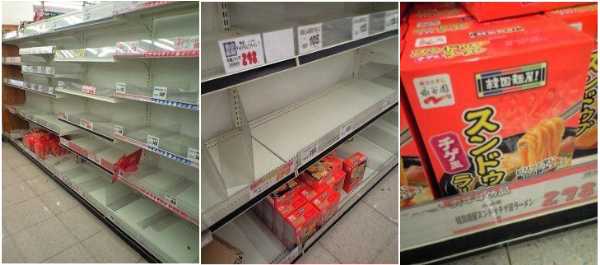 強震過後日本各大超市都有搶購民生物資的情況。照片中貨架上的商品一整排看過去全被搜括一空,唯有小區塊的的貨品「韓國泡麵」。